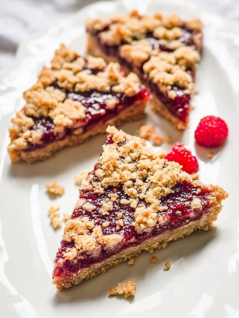 - Die goldbraune, knusprige Textur der Haferstreusel bildet einen wunderschönen visuellen Kontrast zur leuchtend roten Fruchtfüllung in der Mitte.